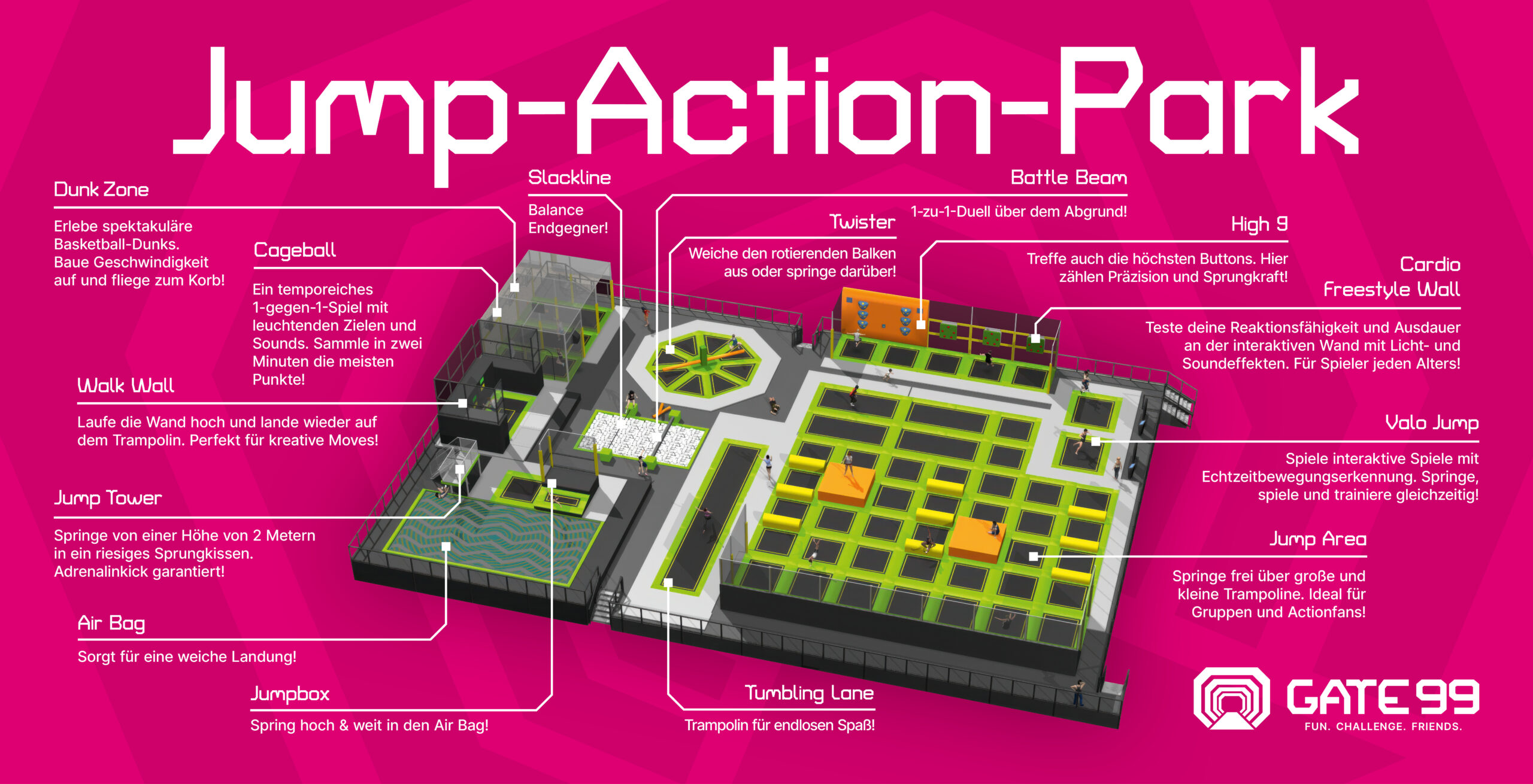 Hochmoderne Attraktionen sorgen für Abwechslung, Teamgeist und spannende Wettkämpfe! Versuche Dich an spektakulären Dunkings in der Basketball-Zone, stelle Dich Hindernisparcours mit kniffligen Challenges oder fordere Deine Freunde auf dem BattleBeam heraus.